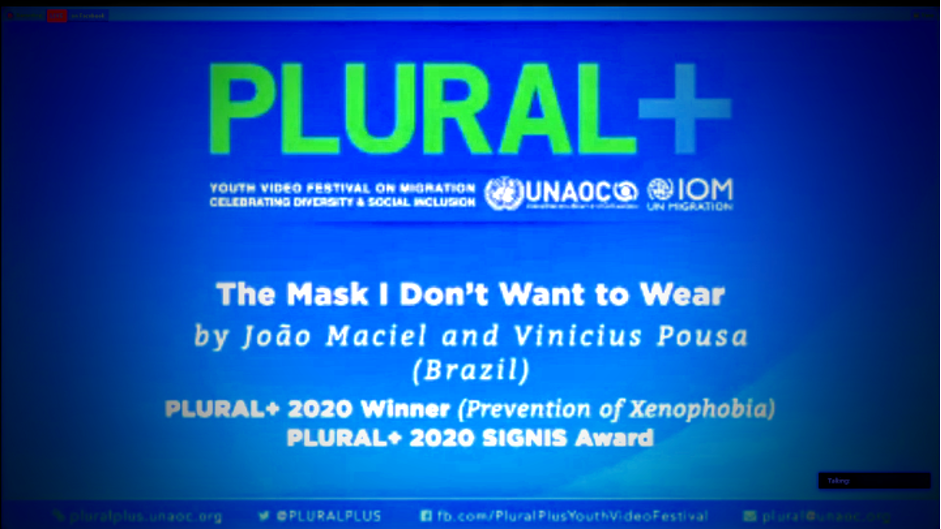 The awards ceremony which was streamed live on the pluralplus website: https://pluralplus.unaoc.org/2020awards/ on December 4, had in attendance, the filmmakers, SIGNIS Plural + jurors, officials from the United Nations Alliance of Civilizations (UNAOC), the International Organization for Migration (IOM). In presenting the award, the Chair of the SIGNIS TV Desk, Frank Frost remarked that the “jury called it a very poetic video, turning a COVID pandemic mask into a metaphor for fighting the much more pervasive global sickness as xenophobia and ill effects that flows from that.”