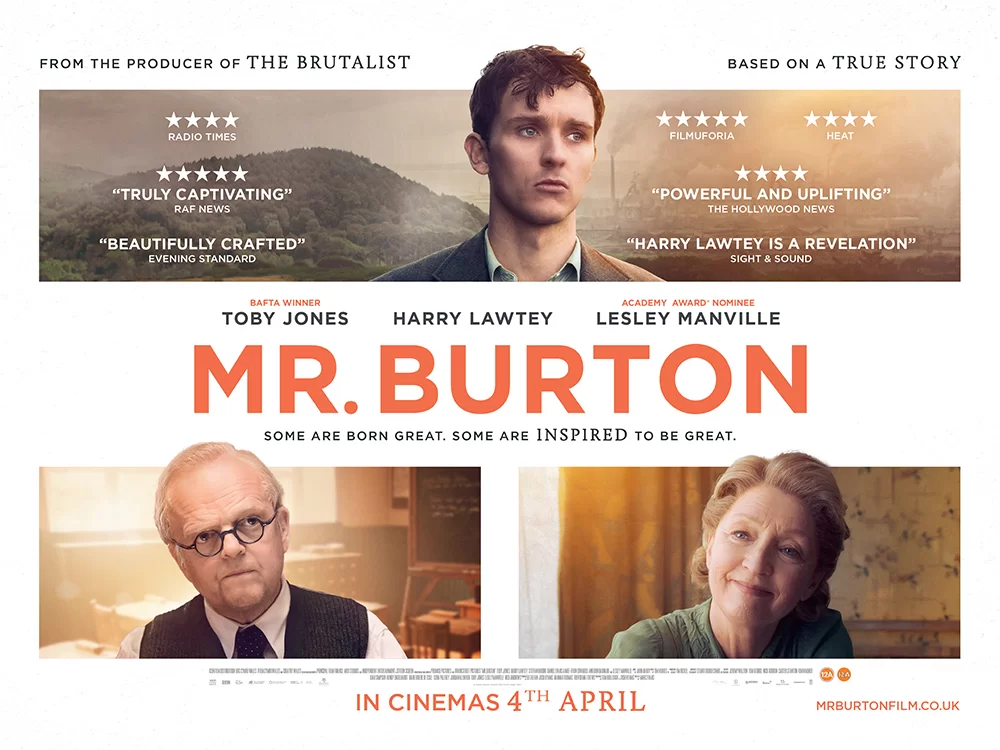 MR. BURTON. Starring Harry Lawley, Toby Jones, Lesley Manville, and Aneurin Bernard. Directed by Marc Evans. Rated M (Mature themes and coarse language). 124 min.
